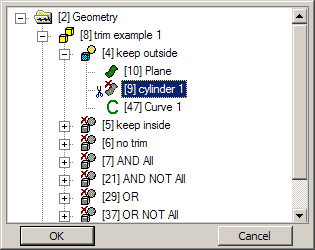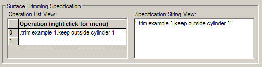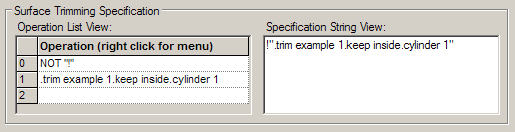 Custom Element 2 – ‘keep inside = NOT (!) outside’ To keep the region inside the cylinder, prefix the trimming surface name with a NOT operator, which is shown as an exclamation point ‘!’. Because the default operation is to keep the outside of the cylinder, a NOT operator specifies to keep the inside of the cylinder.
