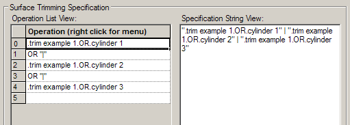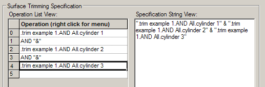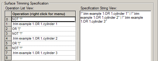Operator sequence: the following examples show valid ordering for trimming surface operators. Note that spaces are ignored unless they are contained in the surface name between quotes •# ”surface name” g # always is the last operator preceding a surface name •!# ”surface name” •“surface 1 name” & “surface 2 name” •“surface 1 name” &! “surface 2 name” > NOT always follows AND •“surface 1 name” |! “surface 2 name” > NOT always follows OR •“surface 1 name” &! # “surface 2 name” •(!“surface 1 name” & “surface 2 name”) | “surface 3 name” > operations inside parentheses are evaluated first