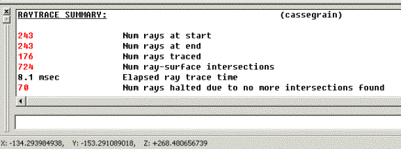 The Output Window and the Command Line The results of actions taken with the information in a FRED document are listed in the output window. For example, if a raytrace is performed then the results of the raytrace are listed in the output window. In addition, the coordinates of the cursor in the visualization window are shown below the output window and command line.