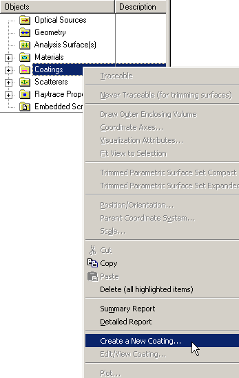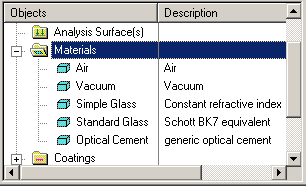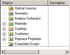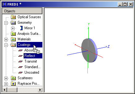 A quicker alternative to copy and paste is drag and drop. FRED geometry objects, materials, coatings, and sources can all be dragged and dropped to make copies. To make copies with drag and drop, simply left mouse click on the object to be copied and while pressing Ctrl key and holding the left mouse button down drag the object to the another node in the same section of system tree and release mouse key and then the Ctrl key. When you press the Ctrl key, you will get a “+” next to the cursor.