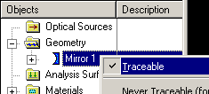 The Traceable Toggle Switch If you want something to be visible in the visualization window (and ray traced), then the object must have the Traceable toggle switch turned on. This option is available in the right mouse click pop-up menu.