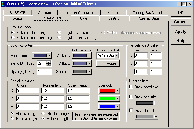 There are times when the rendering of an object is poor or non-existent because the object is fairly small compared to the Outer Trimming Volume. If an object is not rendering in the visualization window (and it is set as Traceable) then reducing the tessellation in the visualization page of the surface edit dialog will likely fix the problem (see the right hand side of the Visualization page).