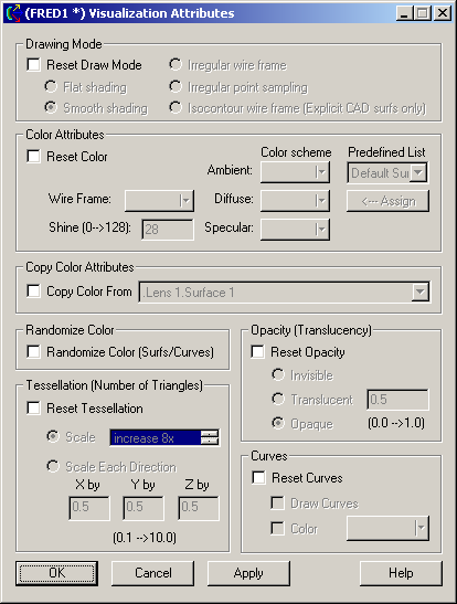 The color, transparency, and surface drawing mode can be changed for all the objects with the Color Attributes dialog available in the pop-up menu from a right mouse click on any geometry node.