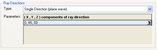 As described in the section above, the direction triplet vector entry control interface has a variety of coordinate system options that can be used to specify the direction vector. Note that each coordinate system option is identified by a one or two letter code (ex. YR, XD, S, etc.). If the user already knows the letter code of the coordinate system they wish to use, a shorthand input method can be used so that the user does not need to activate the full vector entry control dialog. The letter code of the coordinate system specification can be input directly into the vector entry control dialog in the position corresponding to the Axis parameter, with the remaining values being entered in the units required by the coordinate system. For example, suppose the user wants to specify a direction in the "SD - sines of two angles (a,b) in degrees, compute for unit length" coordinate system where the vector is 45 degrees from the Z-axis towards the Y-axis and the Axis parameter is set to Z. In shorthand notation, the vector entry for this specification would be shown below: