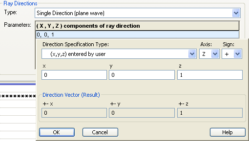 User specifies the polar and azimuth angles in degrees, a and b, for a spherical coordinate system. The Axis parameter specifies the polar angle reference, whose value is then calculated as +- cos(a). The remaining axes must form a right handed coordinate system with the first component value being +-sin(a)cos(b) and the second component value being +-sin(a)sin(b). For example, with the Axes parameter set to Z, the values are computed in the following way: