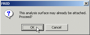 Select the appropriate surface or source for attachment select OK to accept and close the dialog. As with the drag and drop, a warning dialog will be displayed asking for an override if the analysis plane is already attached.