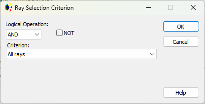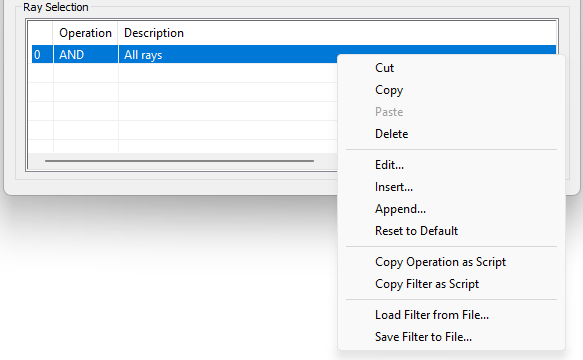 The ‘Cut,’ ‘Copy,’‘Paste,’and ‘Delete’ options operate accordingly on the selected row. The ‘Edit…’, ‘Insert…’, and ‘Append…’ options open the Ray Selection Criterion dialog and allow modification of the current ray filter list: