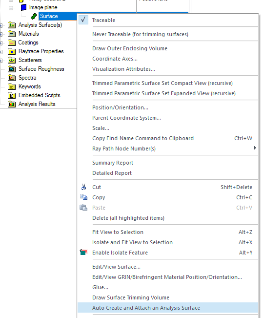 Expand the Analysis Surface(s) folder on the object tree and select an available analysis plane or create a new analysis plane is none is available. Using the mouse, drag and drop the selected analysis plane onto the surface or source of interest.