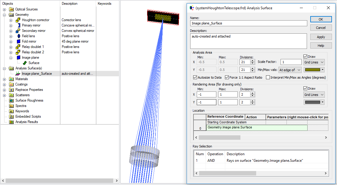 Analysis planes are not required to be positioned coincident with a surface or source entity. If the analysis plane is displaced from an entity of analysis interest, FRED simply projects the rays from the entity along their current trajectories until the intersect the displaced analysis plane. When an analysis plane is attached to a source or surface FRED moves the analysis plane to be coincident with the local origin of the surface or source and imposes a ray selection filter that tells FRED to consider only the rays currently associated with that surface or source.