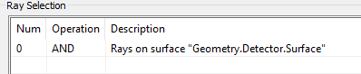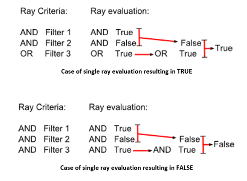 Consider the following examples in which a ray selection criteria definition consisting of three filters is applied to a single ray. The ray selection criteria list is shown on the left and its logical application to the single ray is shown on the right. In the top example the serial evaluation of AND-AND-OR results in TRUE, meaning that the ray passes the selection criteria and is included in the analysis or operation. In the bottom example the serial evaluation of AND-AND-AND results in a FALSE, meaning that the ray does not pass the selection criteria and is not included in the analysis or operation.
