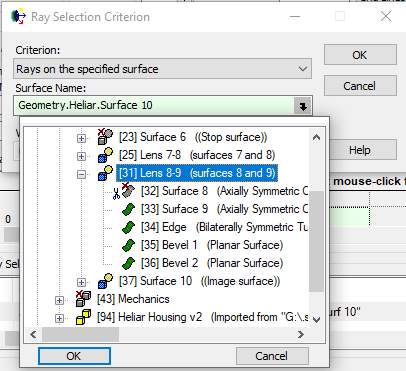Ray Selection Criteria will be available for you to define in nearly every case where a ray-based analysis is being performed, so that the resulting operation displays, prints, or writes the resulting data associated with the subset of rays that match your specified criteria.