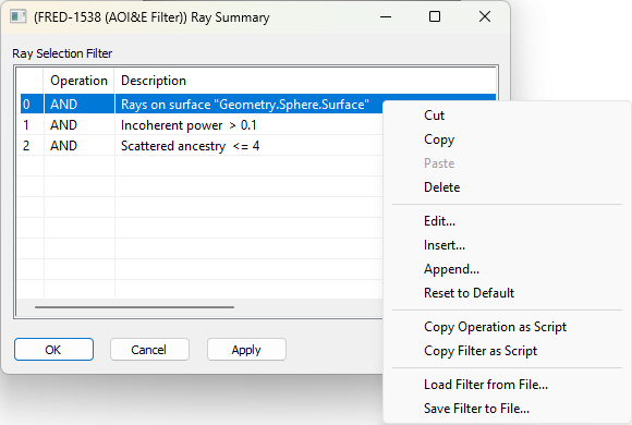 Right mouse clicking in the spreadsheet area of the Ray Selection Criteria list reveals a context menu that will allow modification of the criteria, including a "Reset to Default" option that will restore the ray selection filter to the standard "All Rays" configuration. Alternatively, double clicking on an existing criteria definition (i.e. row in the Ray Selection Criteria list) is equivalent to calling the Edit context menu option on that criteria.