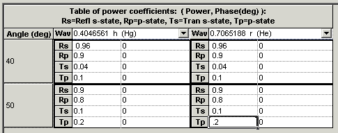 Editing the angle and wavelength The wavelength value can be modified by either typing the new wavelength (in microns) into the "Wav" cell directly or by selecting a new wavelength from the drop down list of predefined values. The predefined wavelengths include a large number of emission lines in addition to a number of common laser wavelengths. Use the scroll bar on the right side of the list to scan through the entire range.