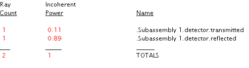 Suppose that a unit power linearly polarized ray at a wavelength of 0.55 microns with equal S and P components is incident on a surface with this coating at an angle of 45 degrees (S = P = 0.5). The incident ray will be split into a reflected and transmitted component. Linearly interpolating between the values of the coefficients, we can determine that the reflected component should have a relative power of 0.93*S + 0.85*P = 0.89, and the transmitted component should have a relative power equal to 0.07*S + 0.15*P = 0.11. After tracing a ray under these conditions and printing the Ray Summary, these calculations are verified as shown in the following image.