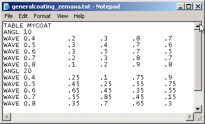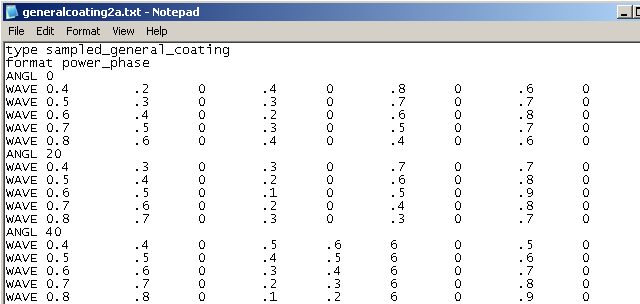 General SampledCoating data from file General Sampled Coating data can be read directly from a text file as long as the text file is properly formatted. Two header lines are followed by coating data, with the first header line reading "type sampled_general_coating" and the second header line reading "format power_phase". Data is grouped by angle of incidence, with the first in the group reading "ANGL val" (val is the angle of incidence in degrees). The remaining lines in the text file have the format, "WAVE l Rs φRs Rp φRp Ts φTs Tp φTp", where l is the wavelength in microns and φij are the respective phases of the four components. An example file format is shown below.