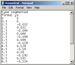 The file format used by the "Replace with Data from File" is shown below. The first line must be "type segmented", the second line is "format [xy][xz][yz][xyz]", and the remaining lines are either two column data corresponding to the format specifications [xy],[xz],[yz] or three column data corresponding to the format specification [xyz]. E.g. for two column [yz]: