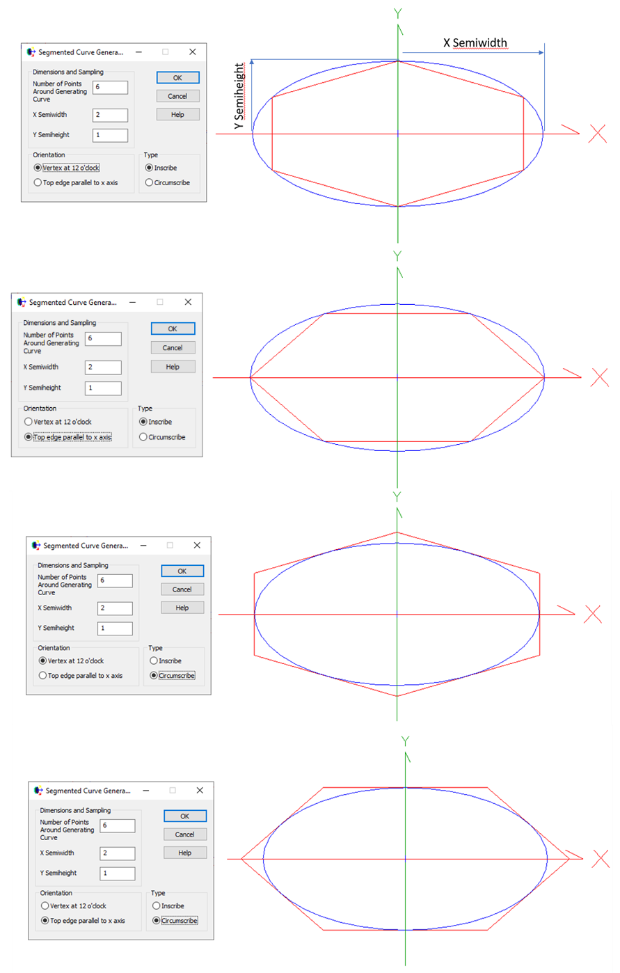 The orientation and the inscribe/circumscribe options control how the segments are positioned around the elliptical curve as shown below: