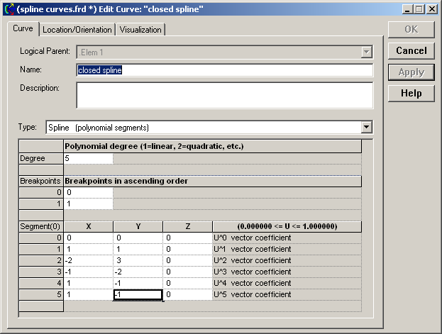 This example creates a closed spline curve, which corresponds to x(t=0) = x(t=1) = y(t=0) = y(t=1) = 0. The X-segment is represented by x(t) = t - 2t2 - t3 + t4+ t5. The Y-segment is given by y(t) = t + 3t2 -2t3 - t4 - t5. The dialog box shown below creates a 5th degree (6th order) spline with breakpoints at 0 and 1 with position vectors (0,1,-2,-1,1,1) for the X-segment and (0,1,3,-2,-1,-1) for the Y-segment.