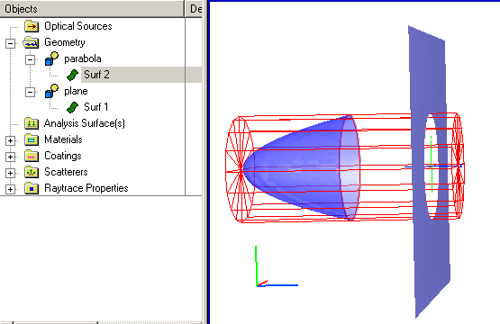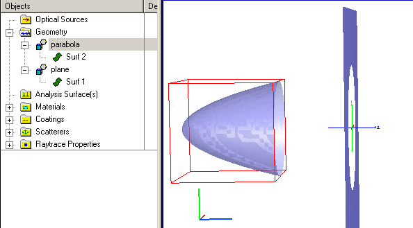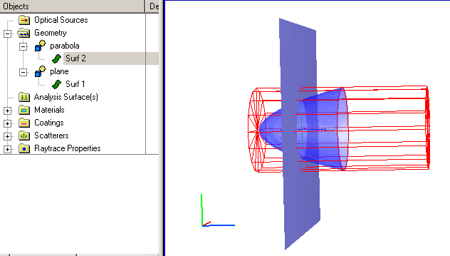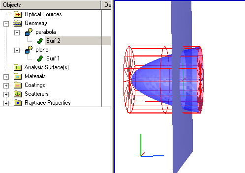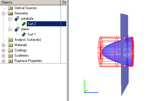 and is given in the specification string view as #".parabola.Surf 2" | ! ".parabola.Surf 2". To achieve this trimming operation it is necessary to extend the Z-value of the parabola trimming volume. Note that this has no effect on the parabola dimensions since its clear aperture is dictated by the trimming volume XY dimensions and not the Z dimension.