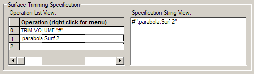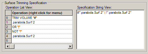 and is shown in the specification string view to be !".parabola.Surf 2". This specification string should be read as, Trim away the parts of Surf 1 NOT (!) on the positive side of Surf 2.