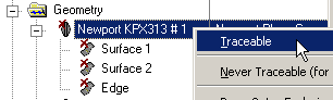 This feature can be accessed by right mouse clicking on an entity (Optical Source or Geometry node) in the object tree and selecting "Traceable" from the list menu.