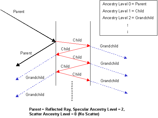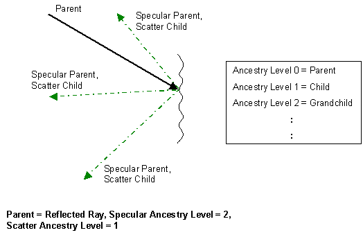 The following figures illustrate Parentage and Ancestry Level splitting. In the first 2 figures, the Specular Ancestry Cutoff has been set to Level 2, which means that Grandchildren rays can no longer be split into specular components. Because the Scatter Ancestry Level has been set to 0, the Raytrace Control will not allow any ray to scatter, even if a Scatter Property has been assigned to the surface. The third figure shows a scattering surface. Note that since the reflected specular ray is the Parent, all of the scattered rays will maintain the Specular Ancestry Level of the incident ray.