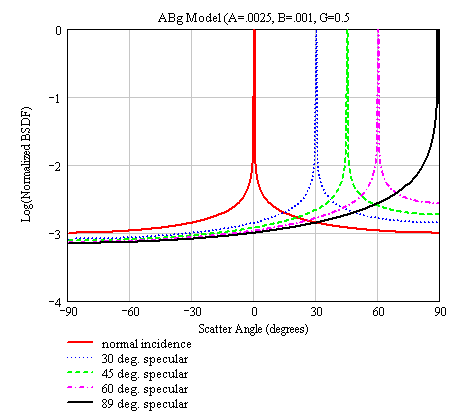 Like the Harvey-Shack scatter model, the ABg model describes scatter from a smooth surface. This model has a logarithmic falloff from specular, with a slope parameter given by G and BSDF given by: