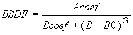 The relative scattered ray power in the specular direction (B-B0 = 0) is Acoef/Bcoef multiplied by the projected solid angle in the specular direction. This product cannot exceed 1 for a 100% scattering surface or the relative ray power contained in the specular ray(s). Failure to satisfy this restriction violates conservation of energy.