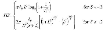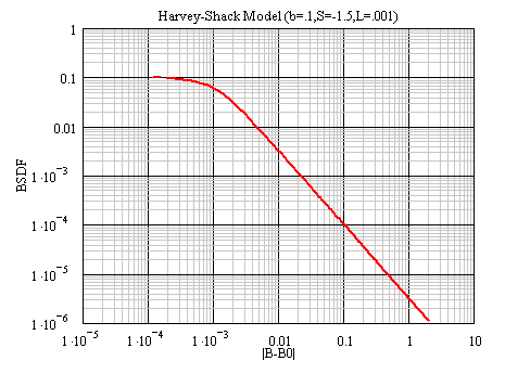 It is therefore possible to make reasonable assumptions for L and S and then solve for b0 to give the same TIS calculated from the RMS roughness. For example, suppose that a mirror surface has a 50 Angstrom RMS roughness with visible light at l = 0.5 um. The TIS calculated from the surface roughness is 0.015791. Without knowing anything further about the surface, it is assumed that S = -1.5 and L = 0.01 radians. Solving for the calculated TIS gives b0 = 1.396225 sr-1, completing the Harvey model definition.
