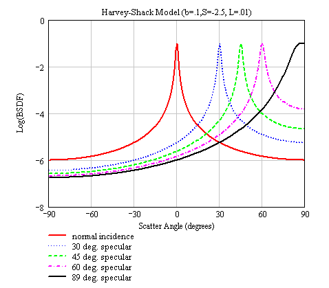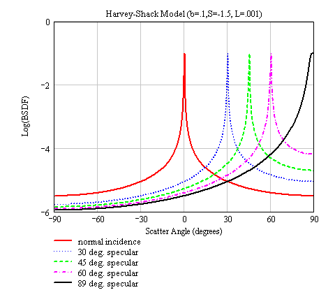 The Harvey-Shack scatter parameters are b0 = 0.1, L = .001, and S = -1.5. Changing the value of L from .01 to .001 shifts the roll-off angle closer to specular, which has the effect of directing more of the scattered light into the specular direction. This also attenuates large angle scatter.