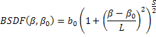 The Harvey-Shack model is linear shift invariant, which means that the BSDF depends only on the difference between the sine of the specular angle (b0) and the sine of the scattered angle (b). The angles b and b0 are always taken in the plane of the incident ray and are measured relative to the surface normal.