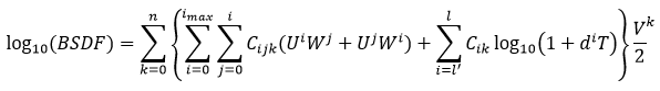 The parameters U, V, W and T have the following meaning, where (a0,b0) is the specular direction and (a,b) is the scatter direction. U = a2 + b2 V = aa0 + b0 W = a02 + b02 T = (a-a0)2 + (b-b0)2 = U - 2V + W