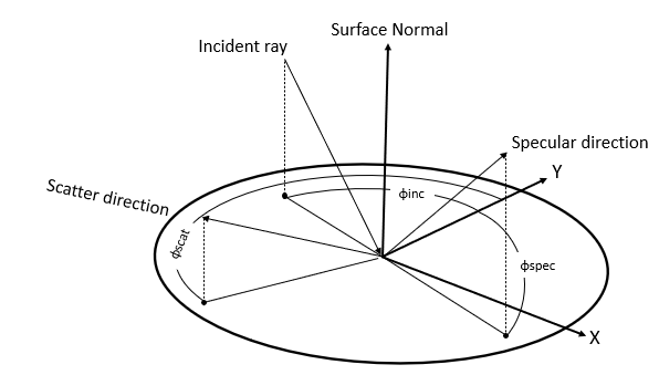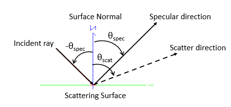 The coordinate system for in-plane scatter data is shown below, where a ray is incident on a scatter surface with polar angle -θspec with respect to the local surface normal. An outgoing scattered ray direction has angle θscat with respect to the surface normal and the outgoing specular ray direction has angle θspec with respect to the surface normal. All three rays, the incident ray, specular ray, and scattered ray, lie in the same plane with the surface normal. In-plane scatter data, acquired from scatterometer measurements or published data, is more common than out-of-plane data.