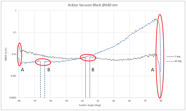 If we consider the BSDF angle plot below, we can see that there are two sets of in-plane BSDF measurements present. A scan of the BSDF from -90 to +90 degrees scatter angle was made for a source beam incident on the sample at 3 degrees and a second scan over the same scatter angle range was made for a source beam incident on the sample at 60 degrees.