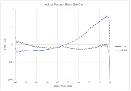 It is equally as important to plot the raw tabular data before providing it to FRED, in order to (a) understand what the expected behavior of the resulting Tabular BSDF model should be, and (b) identify any modifications or corrections to the measured dataset. Consider the 2D angle BSDF plot below of a commercially available black surface treatment from Acktar, where in-plane BSDF scans for two specular angles, 3 degrees and 60 degrees, are shown. Each curve in the plot corresponds to an in-plane BSDF scan associated with either a 3 degree incident angle or a 60 degree incident angle.