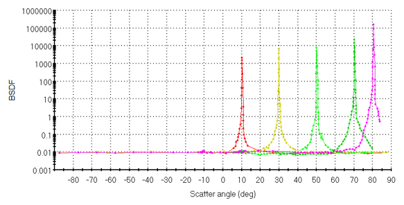 An example of this behavior is shown below, where the BSDF data for a specular black paint sample is loaded into the Tabulated BSDF model. The 2D BSDF angle plot of the raw data in the file is shown below, where the specular angles of the dataset are 10, 30, 50, 70 and 80 degrees.
