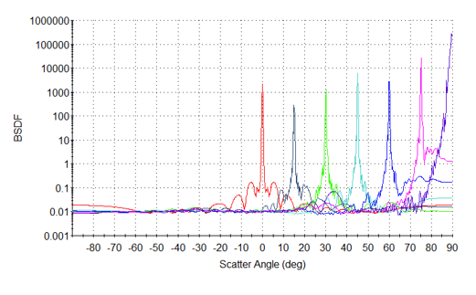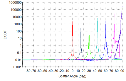 The BSDF curves shown are characteristic of diffuse black surface treatments; having a quasi-lambertian behavior at nearly normal-incidence and acquiring a mild tilt and curvature as the angle of incidence is increased (to 60 degrees, in this example). Any Tabular BSDF scattering model constructed from this dataset should exhibit the same functional behavior and closely match the magnitudes of the BSDF for any incident specular angle and outgoing scatter direction.