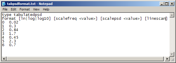 The file format for Tabulated PSD data is shown below. There is a two line header followed by data in two columns (freq PSD). Entries in [] are optional.
