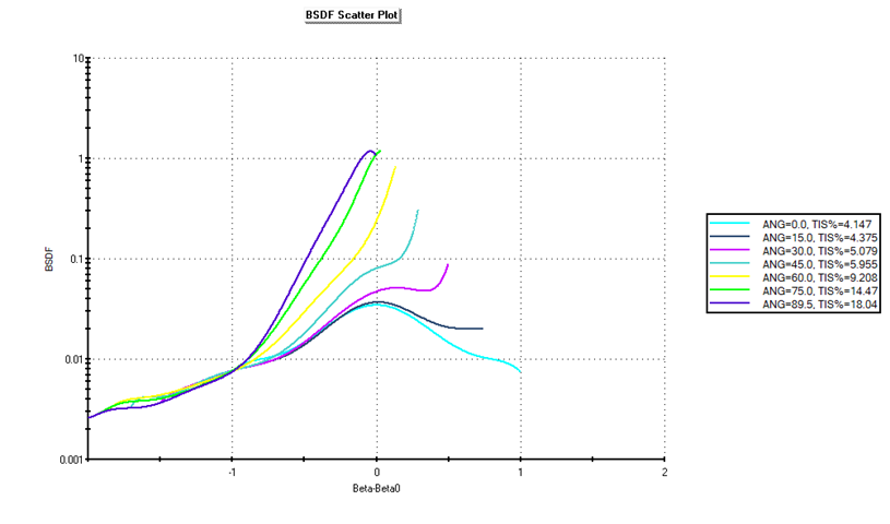 This plot type is useful for BSDF that exhibit a “peak” around the specular direction (i.e. polished surfaces or treatments that have a “gloss” component) and will emphasize the near-specular behavior. As you move to the left on the |β – β0| axis you move towards the specular direction. As you move to the right on the |β – β0| axis you move away from the specular direction.