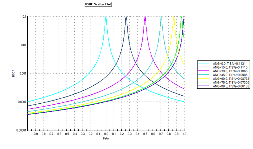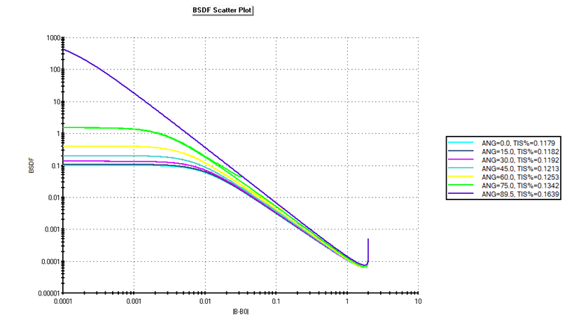The sample plot to the right shows that the peak BSDF value in the specular direction is increasing with larger angles of incidence on the scattering surface.