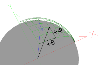 Indicated by the prefix, "tp", this convention allows the user to specify the list of specular directions in a spherical coordinate system. Directions are specified as (q,f), where q is the polar angle (q=0 is aligned to the Z axis of the scatter model's local coordinate system) and f is the azimuthal angle (f=0 is aligned to the +Y axis). Positive azimuthal angles rotate clockwise from +Y to +X. A graphic of the coordinate system convention is shown below.