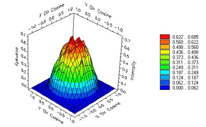 This directional apodization option scales all the rays in the source to have an cosn or sinn intensity distribution based on ray direction. The following images show the source and intensity distribution for an isotropic plane of random rays emitting into a 90o cone half angle with cosn or sinn directional apodization. The functional form was cos3.