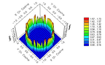 The Inverse Lambertian in a Given Direction apodization type scales all source rays by their direction to give an Inverse Lambertian intensity distribution. This effectively apodizes the rays with a cos-1(f) factor, where f is the elevation angle in polar coordinates. Note that if the source rays are set to be Lambertian on the Positions / Directions tab of the source dialog and then the Inverse Lambertian in a Given Direction apodization is chosen, the source intensity distribution would effectively be isotropic. The following images show the source and intensity distribution for an isotropic plane of random rays emitting into a 90o cone half angle with the Inverse Lambertian in a Given Direction apodization applied.