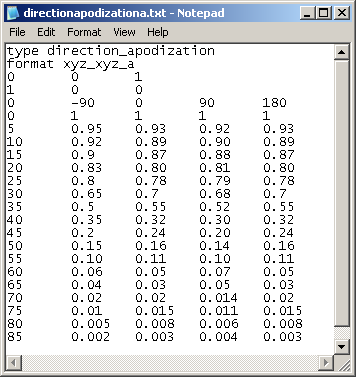 Apodization data can be read from a properly formatted text file using the "Replace With Data From a File" option, accessible by right mouse clicking in the spreadsheet area. The text file contains two header lines, two vectors (polar and azimuthal direction vectors) and then the data. The first header line must read "type direction_apodization", the second header line must read "format xyz_xyz_a", the third line contains the X, Y and Z components of the polar vector, the fourth line contains the X, Y and Z components of the azimuthal vector, the fifth line is a "0" followed by each of the sampled azimuthal angles (the zero is ignored), and the remaining lines are the polar angles and apodization factors in the form "angle val val val .....". The apodization values must be <= 1. An example file format is shown below with four azimuthal angles (-90o, 0o, 90o, 180o) and eighteen polar angles (0-85deg in 5o steps).