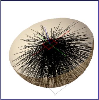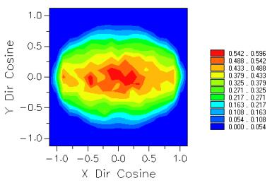 The Sampled as a Function of Spherical Angles direction apodization type scales all source rays to an arbitrary intensity pattern defined in spherical coordinates. Apodization factors are entered as a function of azimuth and polar angles and values are linearly interpolated between these data points. If data is entered for only one Azimuth angle, then the apodization profile is considered rotationally symmetric. The following images show the source and intensity distribution for an isotropic plane of random rays emitting into a 90o cone half angle with the Sampled as a Function of Spherical Angles apodization applied.