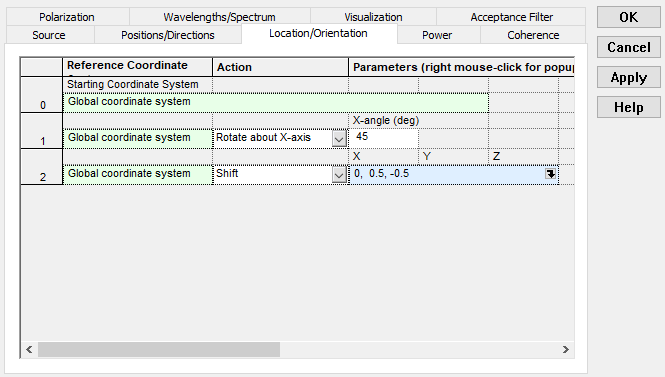 Step 2 - Add an optical source Right click on the Optical Sources folder and select “Create New Detailed Optical Source” from the list menu. On the Location/Orientation tab, right click in the operations list and select “Append”. Change the action for this modifier to “Rotate about X-axis”. Set the X angle to 45°. Append another modifier and choose Shift for the action. Set the Y value to 0.5 and the Z value to –0.5. The dialog should look like like the following (press OK):
