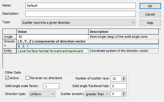 Step 5 - Assign surface scatter and importance sampling Switch to the Scatter tab of the Surface 2 dialog, select the White Lambertian scatter model from the list of available scatter properties and press the Assign button. The bottom portion of the dialog defines any Scatter Direction Region(s) of interest, which specifies the directions into which rays should scatter from the surface. Every surface has a "Default" scatter direction region of interest, shown in the dialog below, which will generate scattering into the forward or reverse hemisphere relative to the surface normal if the scatter model allows it. No modification to the default importance sample needs to be made, though the importance sample definition can be viewed by selecting the "Default" entry in the Scatter Direction Region(s) of Interest and then pressing the Edit/View button.