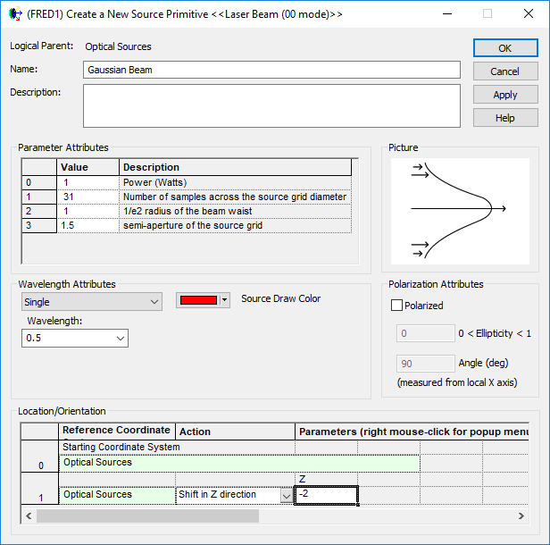 In this tutorial, a Laser Beam (00 mode) type Source Primitiveis going to be created as the input to the beam expander. Right mouse click on the Optical Sources folder and select "Create New Source Primitive" from the context menu and then choose "Laser Beam (00 mode)" from the sub-menu. Use the following settings for the source: Name: "GaussianBeam" Power: 1.0 Number of samples...: 31 1/e2 waist radius: 1.0 Grid semi-aperture: 1.5 Wavelength: Single, 0.5 microns Source Draw Color: Red Position: -2 along Z, relative to the first surface of L1