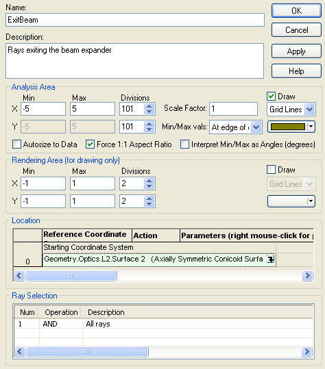 Name = ExitBeam Description = Rays exiting the beam expander Analysis Area X Min = -5 Analysis Area X Max = 5 Divisions (X and Y) = 101 Rendering Area Draw = False Location = Coincident with "Geometry.Optics.L2.Surface 2"