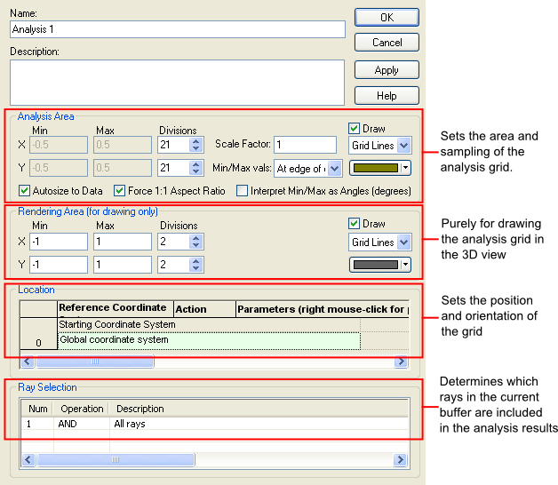 Analysis Area Although the default option for defining the analysis area uses "Autosize to Data", this is almost never recommended. This option calculates the geometrical extent of the rays included in the analysis and sets the size of the grid to enclose those extents. It is recommended that the user manually set the X and Y Min/Max extents for the analysis area to ensure predictable results. Also note that because the autosize feature is geometrical, the results are likely not appropriate for coherent analysis since the field dimensions can be much different than the ray extents.